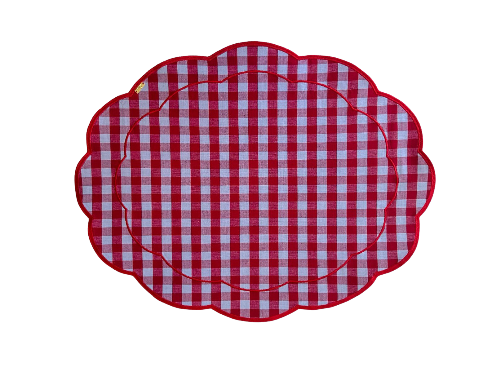 Lugar americano dupla face, um lado xadrez vermelho com branco e um lado vermelho, acabamento com bordado vermelho.