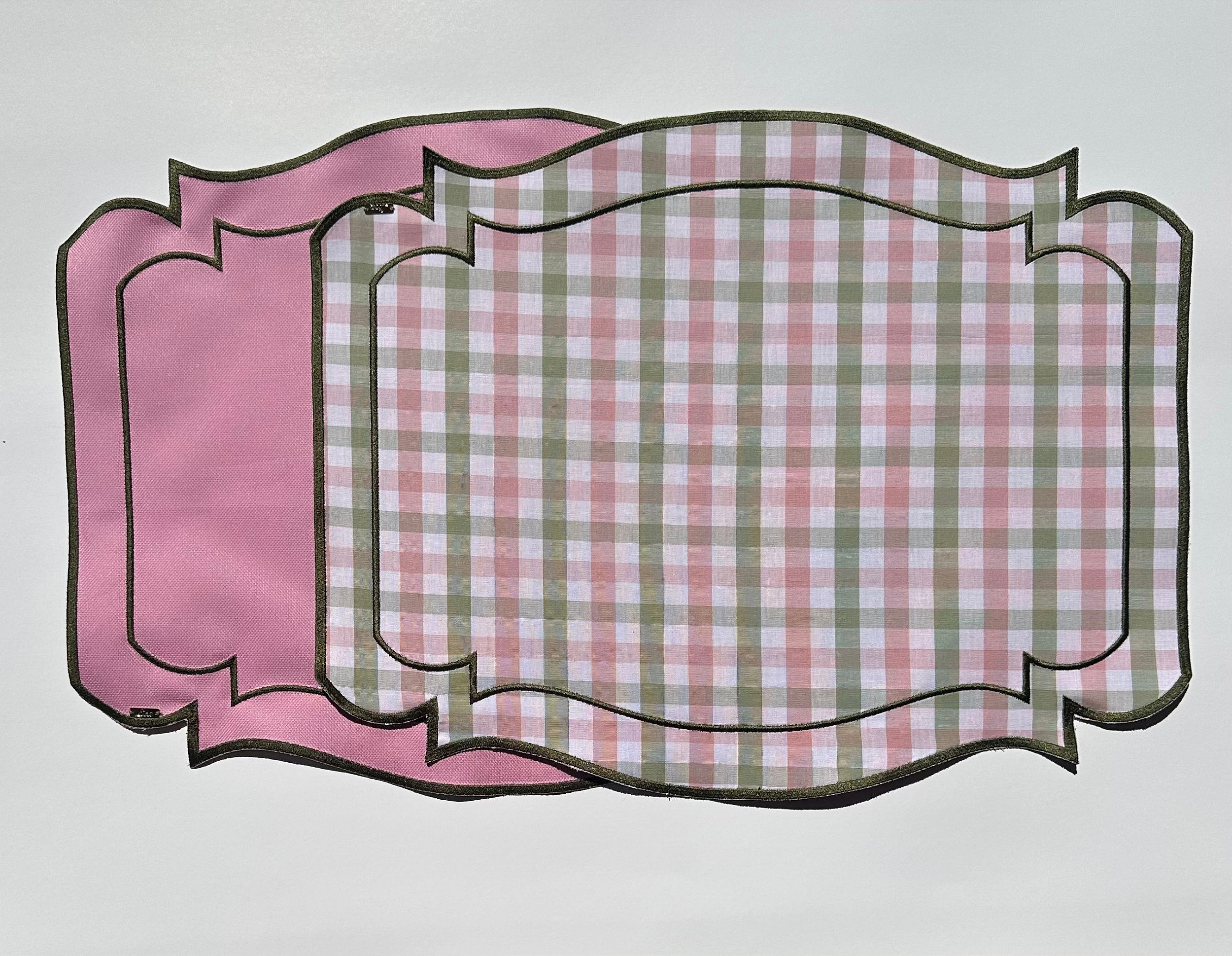 Lugar americano dupla face, com um lado em rosa claro e o outro em xadrez verde e rosa. Acabamento delicado com bordado verde musgo.
